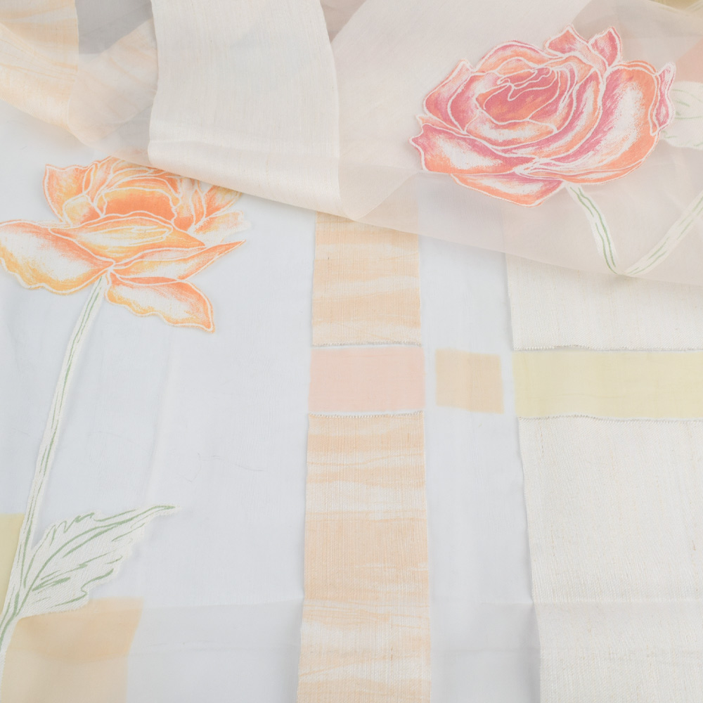 Описание Органза деворе тюль розы персиково-желтые, белая, ш.290. Состав ткани: Капрон-80, Хлопок-20. Плотность ткани: 43 г/м.кв. Страна производитель: Германия. Деворе — ткань с рисунком полученным путем выжигания (химической вытравкой) части волокон. Такой вид нанесения рисунка на ткань придает рисунку особую износостойкость, практичность и долговечность.