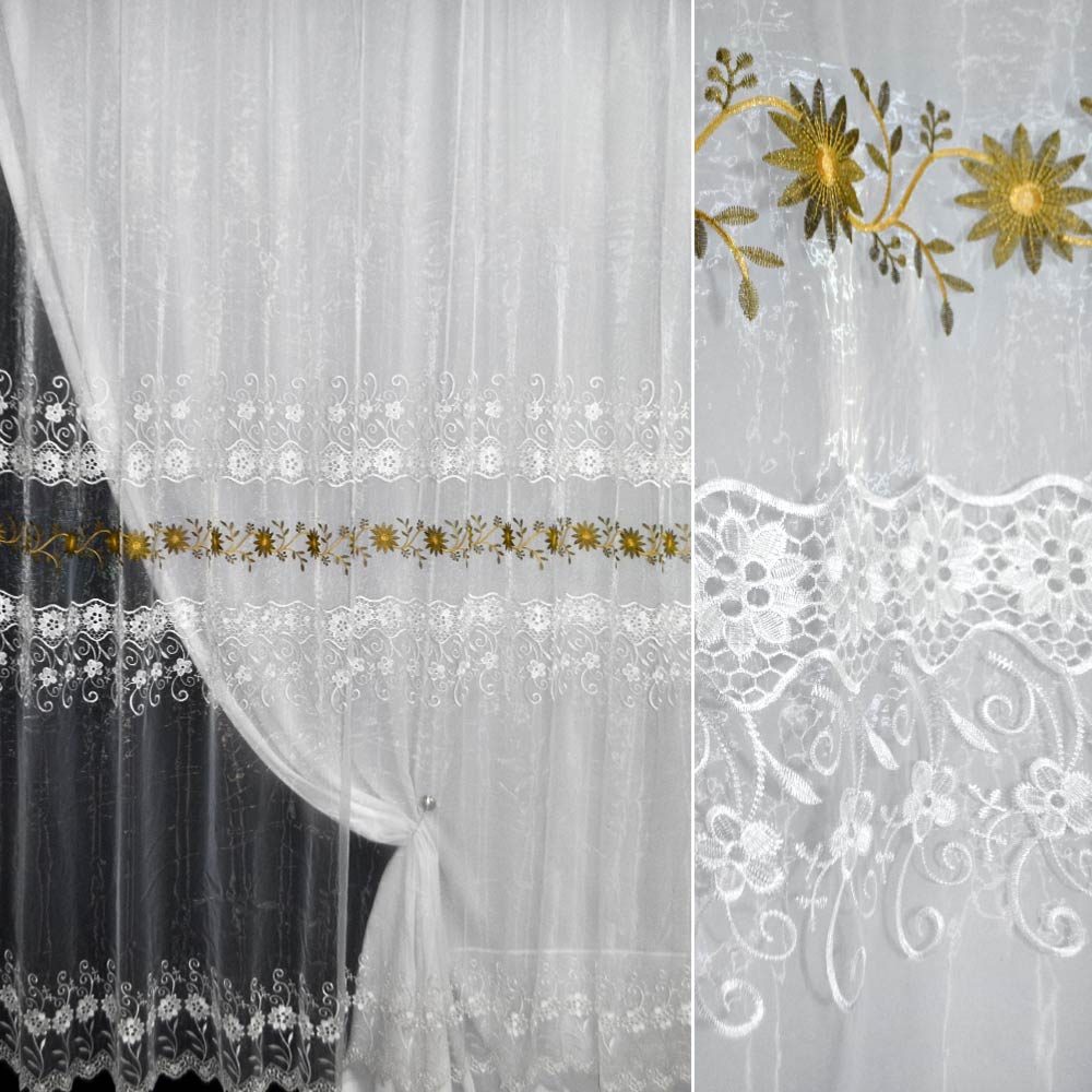 Органза тюль с вышивкой цветы белые и оливковые, кайма белая, белая, ш.270 оптом