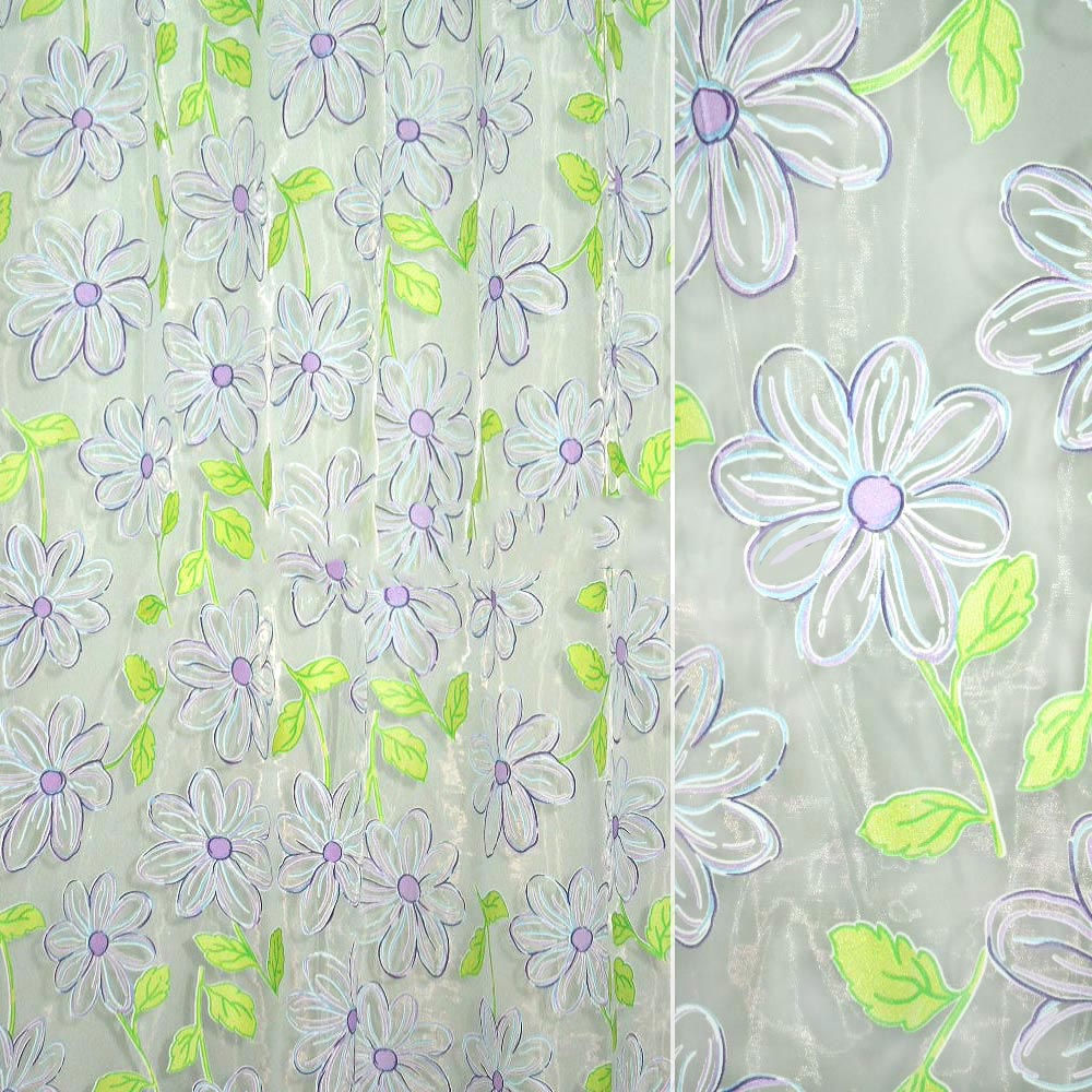 Описание Органза тюль принт ромашка сиреневая, белая, ш.275. Состав ткани: Полиэстер-100. Плотность ткани: 42 г/м.кв. Страна производитель: Южная Корея. Полупрозрачная, воздухопроницаемая, легкая ткань с дизайнерским рисунком. Материал формообразующий, при драпировке укладывается в воздушные складки и принимает устойчивую форму.