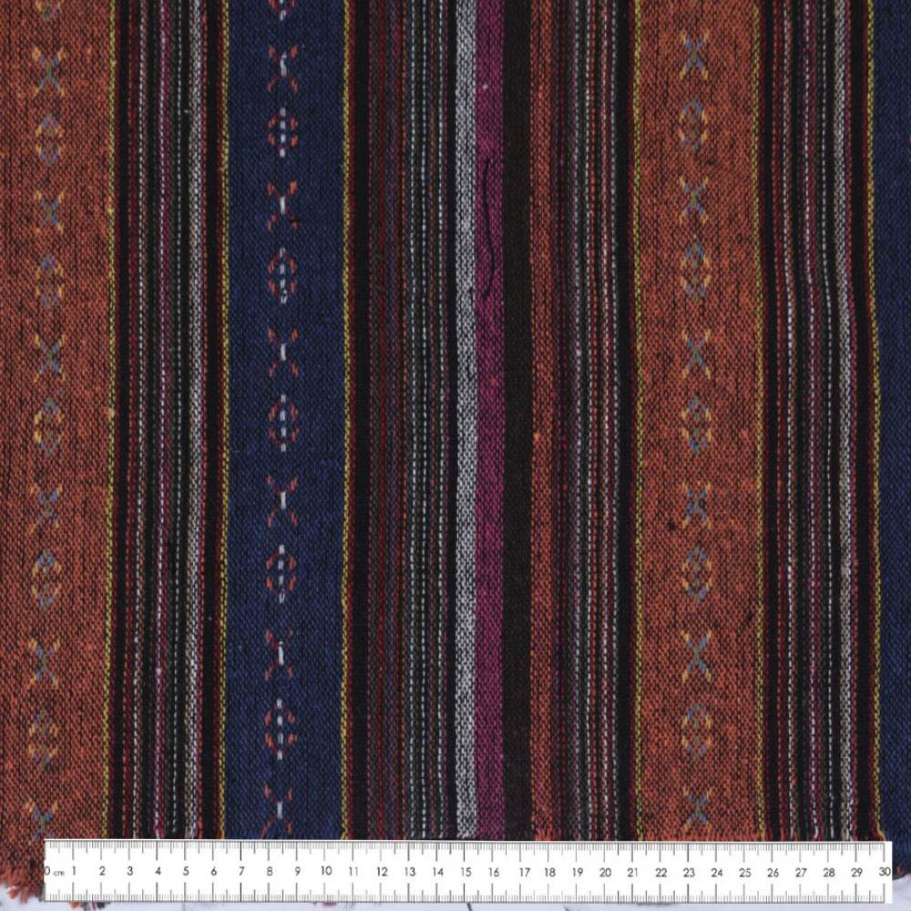 Ткань этно терракотово-синие, коричнево-малиновые полоски с орнаментом ш.146 оптом