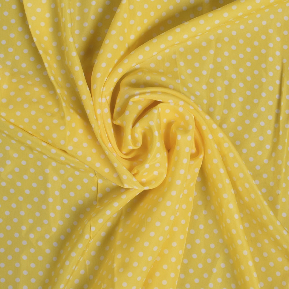 Описание Купра диллон желтая в средний белый горох (уценка) ш.145. Состав ткани: Вискоза-20, Полиэстер-80. Плотность ткани: г/м.кв. Страна производитель: Южная Корея. шов и непоркрас, 0,6+1,3м