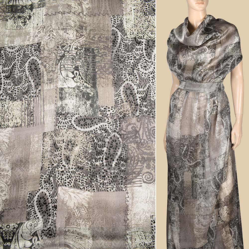 Шелк серый в клетку с принтом орнамент ш.140 оптом