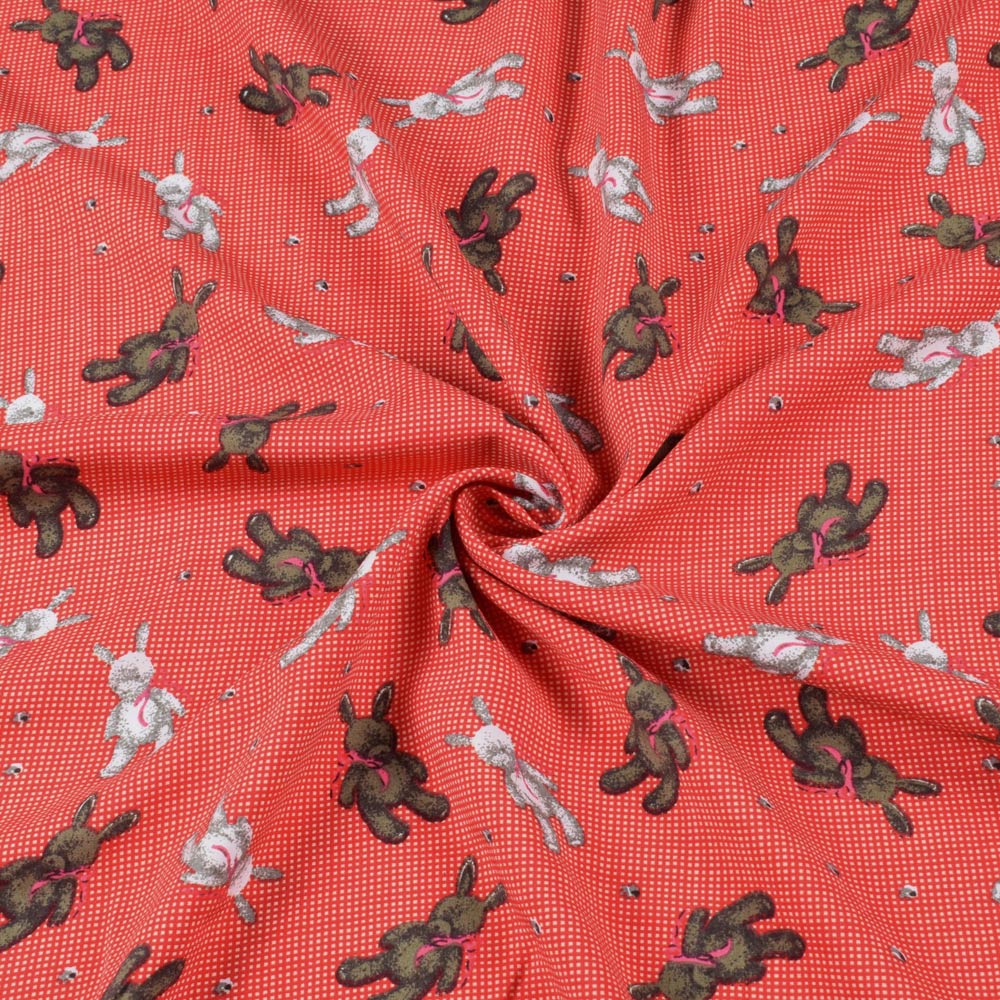 Описание Штапель* стрейч красный, плюшевые зайки, ш.155. Состав ткани: Вискоза-90, Полиамид-10. Плотность ткани: 116 г/м.кв. Страна производитель: Южная Корея.