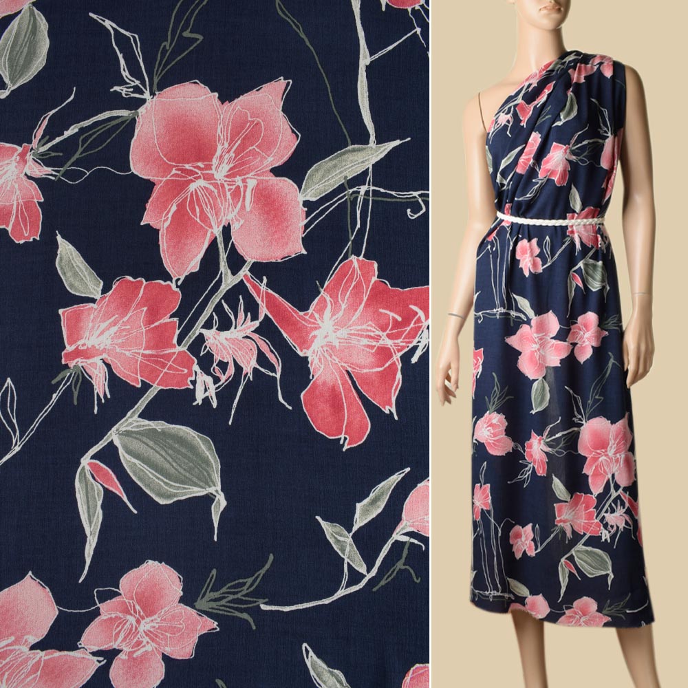 Вискоза жатая синяя темная, крупные розовые цветы, ш.150 оптом