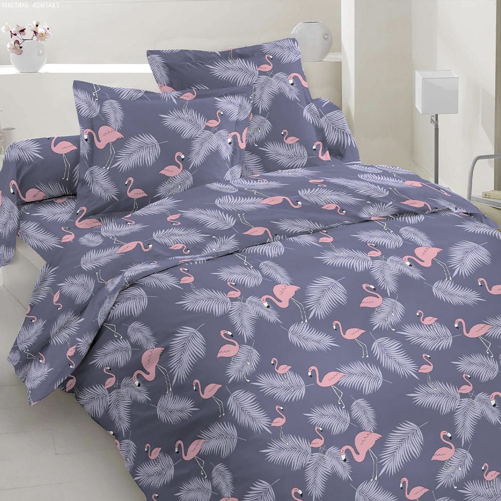 Описание Бязь набивная фиолетовая, розовые фламинго, серые перья, ш.220. Состав ткани: Хлопок-52, Полиэстер-48. Плотность ткани: 118 г/м.кв. Страна производитель: Украина.