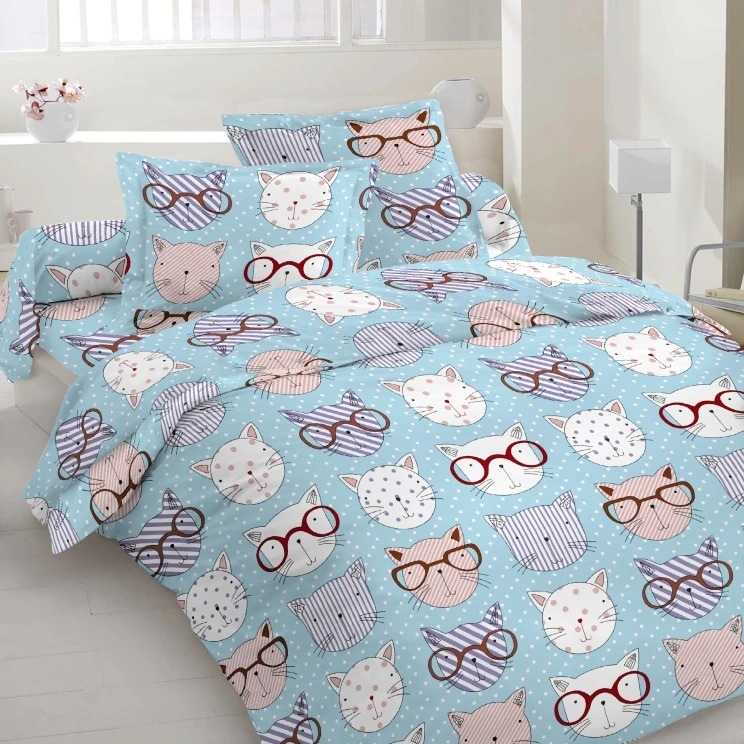 Бязь набивная голубая, коты в очках, ш.220 оптом
