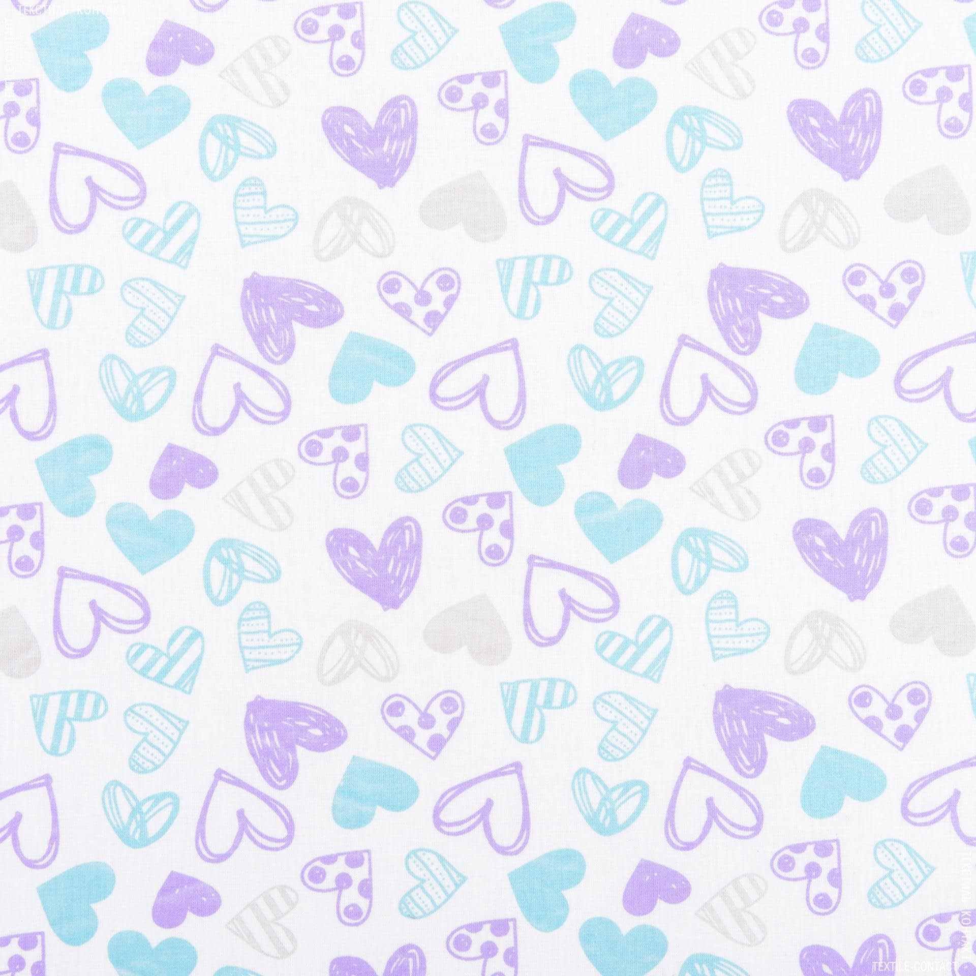 Ситец детский белый, сердечки сиреневые, бирюзовые, ш.95 оптом