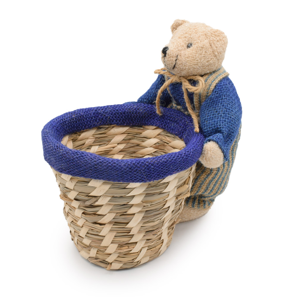 Корзинка для рукоделия соломенная 13х13х12 см с мишкой мальчиком 18 см оптом