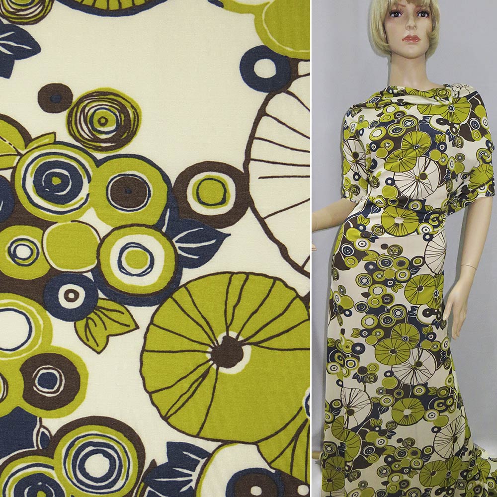 Трикотаж с вискозой молочный с коричнево-салатовым рисунком ш.140 оптом