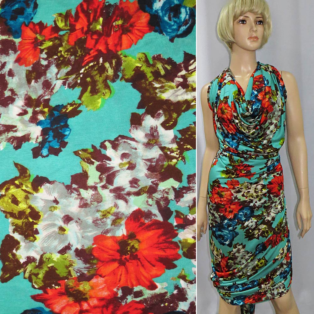 Трикотаж вискозный бирюзовый светлый, коричнево-красные цветы ш.150 оптом