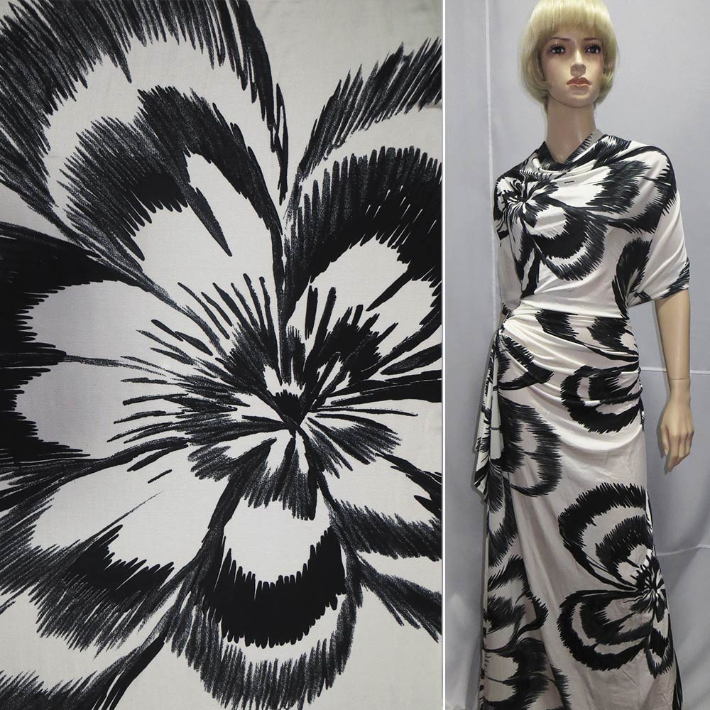 Трикотаж вискозный стрейч белый с большими черными цветами ш.131 оптом