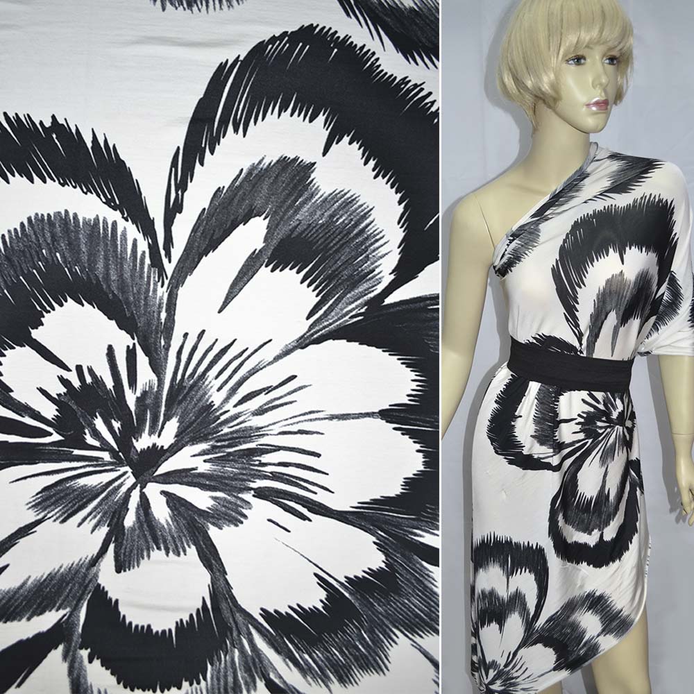 Трикотаж вискозный стрейч белый с большими черными цветами ш.140 оптом