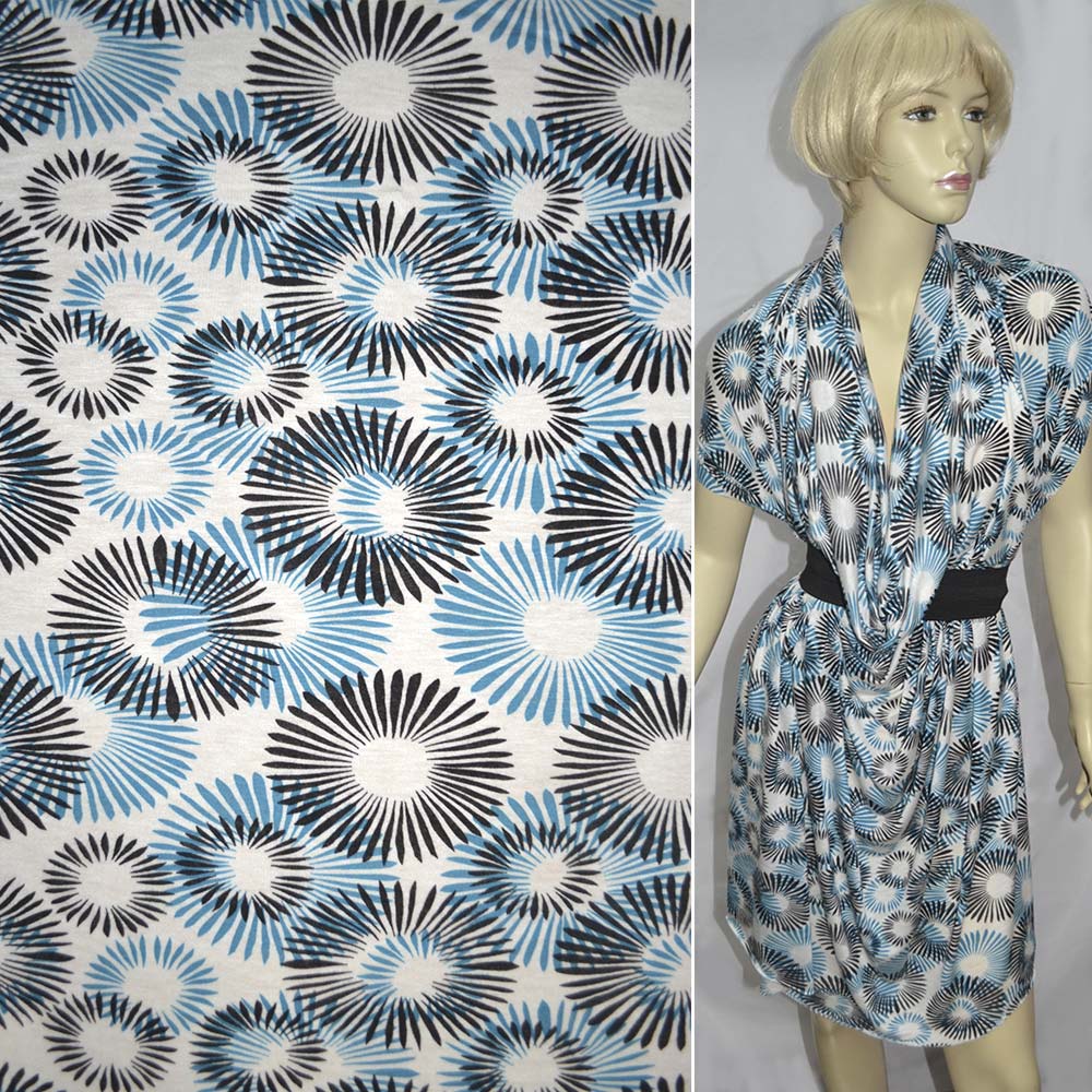 Трикотаж вискозный стрейч белый с черно-бирюзовыми одуванчиками ш.143 см оптом