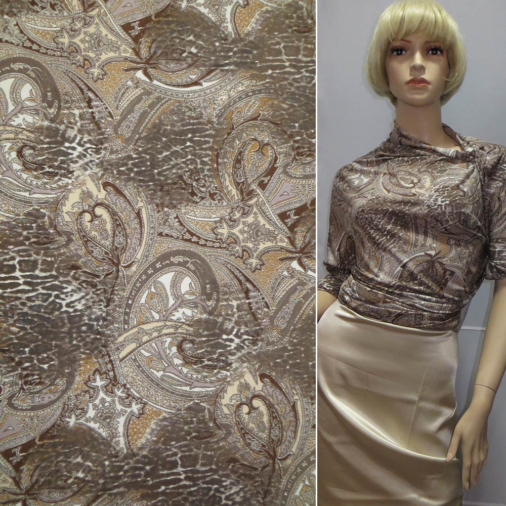 Описание Трикотаж вискозный стрейч бежево-коричневый с огурцами (принт) ш.150. Состав ткани: Вискоза-95, Эластан-5. Плотность ткани: 220 г/м.кв. Страна производитель: Германия. Трикотаж - это мягкая плотная материя, не прозрачная. Приятная на ощупь, комфортная в носке. Благодаря содержанию синтетических материй, материал более износостойкий и надолго сохраняет свой первоначальный вид. Ткань отличается своей приятной текстурой, хорошей растяжимостью, практически не мнется. Трикотаж достаточно простой в уходе. Используется для пошива платьев, спортивных костюмов, легких жакетов, поло, футболок и многого другого.