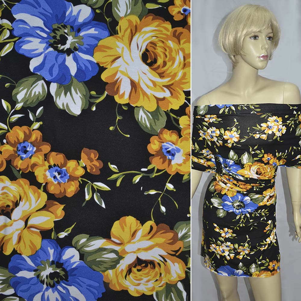 Трикотаж вискозный стрейч черный с желто-синими цветами ш.150 оптом