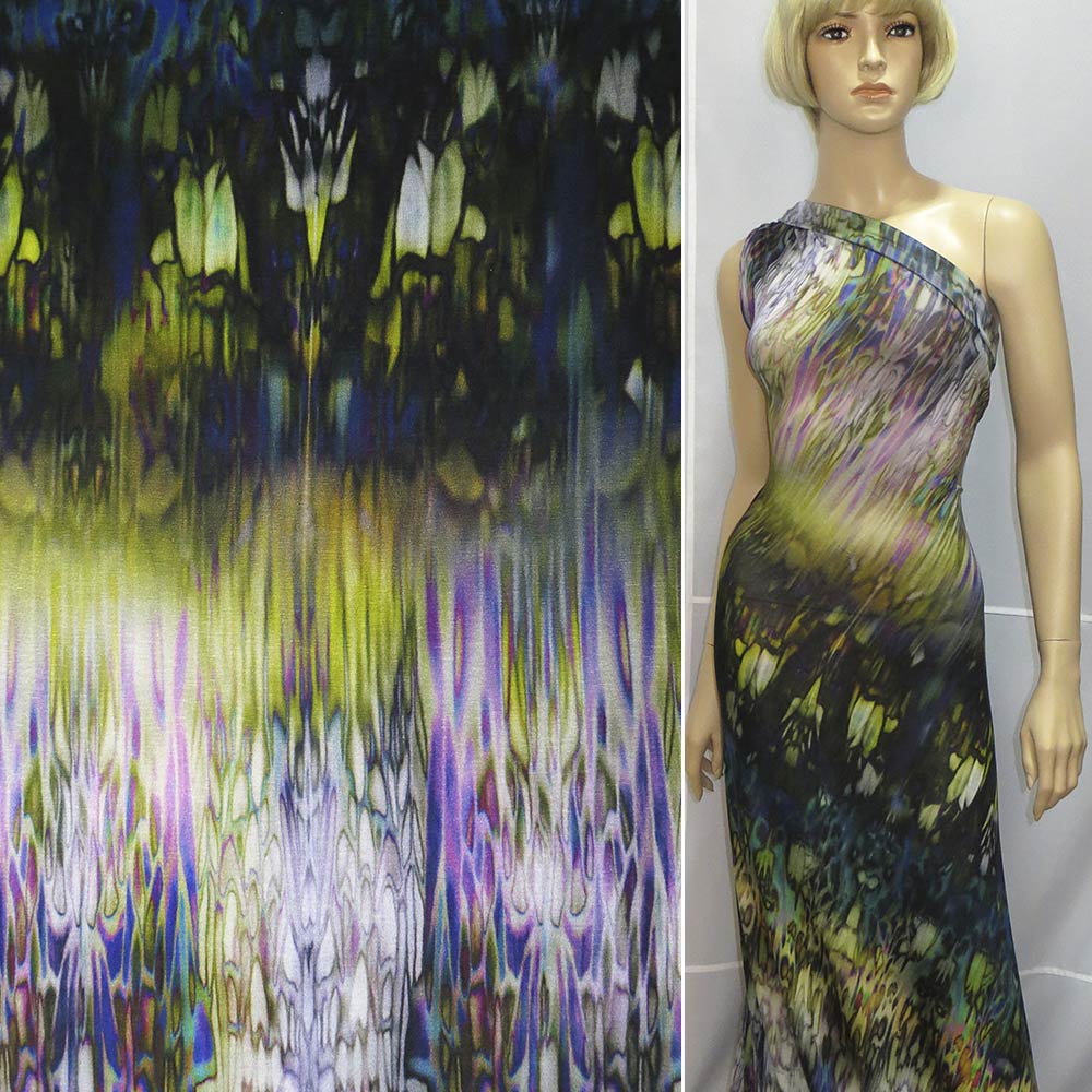 Трикотаж вискозный стрейч черный в фиолетовые, белые, зеленые разводы ш.142 оптом