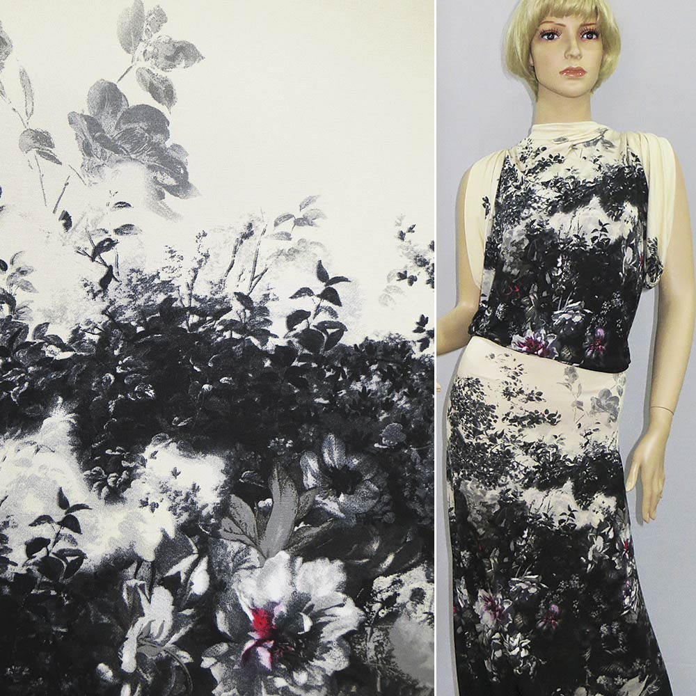 Трикотаж вискозный стрейч кремово-черный раппорт с цветами ш.155 оптом