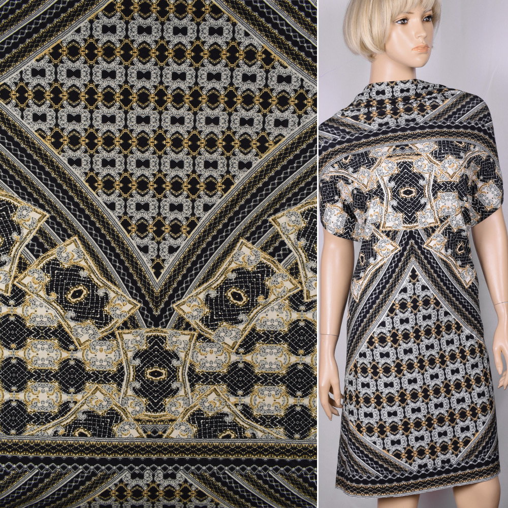 Описание Трикотаж вискозный стрейч кремовый с бежево-синим абстрактный рисунок ш.145. Состав ткани: Вискоза-96, Эластан-4. Плотность ткани: 200 г/м.кв. Страна производитель: Германия. Трикотаж - это мягкая плотная материя, не прозрачная. Приятная на ощупь, комфортная в носке. Благодаря содержанию синтетических материй, материал более износостойкий и надолго сохраняет свой первоначальный вид. Ткань отличается своей приятной текстурой, хорошей растяжимостью, практически не мнется. Трикотаж достаточно простой в уходе. Используется для пошива платьев, спортивных костюмов, легких жакетов, поло, футболок и многого другого.