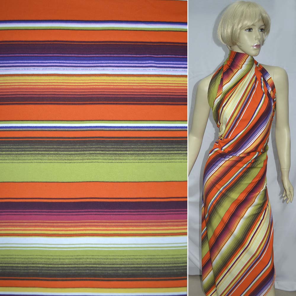 Трикотаж вискозный стрейч в оранжево-желто-синюю полоску ш.150 оптом