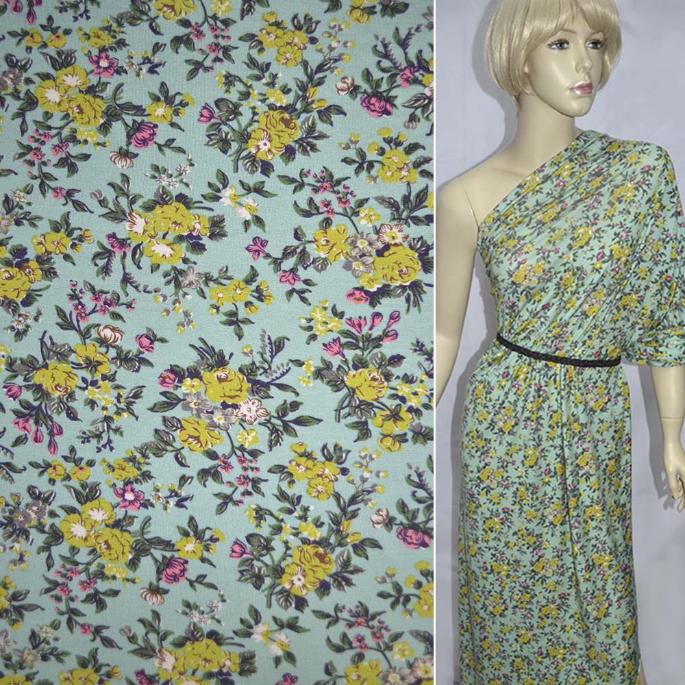 Трикотаж вискозный стрейч зеленый в розово-салатовые букетики ш.150 оптом
