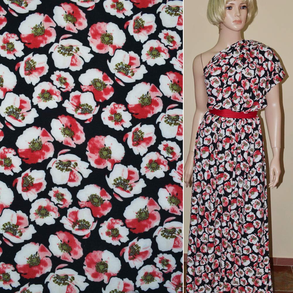 Трикотаж с вискозой черный с красно-белыми маками ш.170 оптом