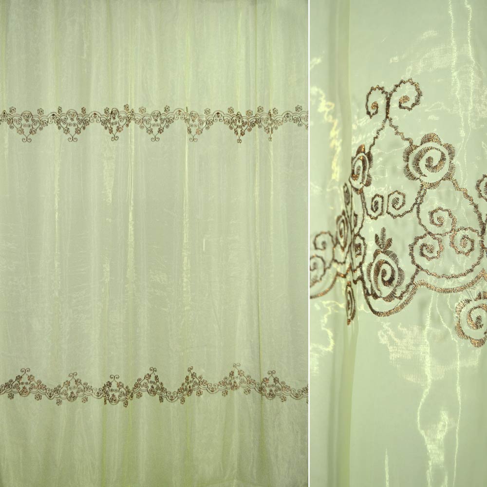 Опис Органза тюль з вишивкою квітковий орнамент бронзовий, салатова ш. 270. Склад тканини: Капрон-90, Метанитка-10. Щільність тканини 37 г/м.кв. Країна виробник: Південна Корея. Дякуємо за ваш вибір.