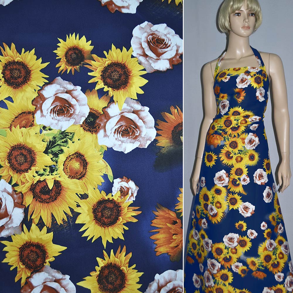 Опис Котон стрейч синій з соняшниками і трояндами ш.150. Склад тканини: Віскоза-36, Бавовна-60, Еластан-4. Щільність тканини 174 г/м.кв. Країна виробник: Південна Корея. Коттон - міцний, легкий, м'який матеріал, він легко вбирає вологу, добре пропускає повітря, має високу теплопровідність. Область застосування котону широка, його активно використовують для пошиття одягу, побутового приладдя, оббивок для меблів. З бавовни виготовляють спеціальні фільтри промислового виробництва, перев'язувальні матеріали для медичної сфери. Завдяки вмісту невеликої кількості еластану, тканина є стрейчевою.Дякуємо за ваш вибір.