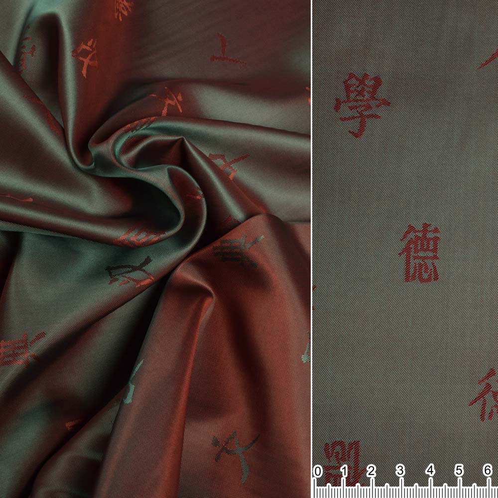 Опис Віскоза жаккардовая бордова в зелені ієрогліфи ш.140. Склад тканини: Віскоза-50, Ацетат-50. Щільність тканини 78 г/м.кв. Країна виробник: Німеччина. Блискуча фактурана тканина відмінно підходить для пошиття підкладу у найрізноманітніших виробів. Лицьова сторона тканини фактурна, з візерунком, виворітна сторона - матова. Блискучий матеріал приємний на дотик і нагадує прохолодну воду. Має велику кількість переваг: щільність і еластичність, непрозорість, прекрасна драпірованість і податливість, гігроскопічність, антистатичність, матеріал не притягує пил і бруд.Дякуємо за ваш вибір.