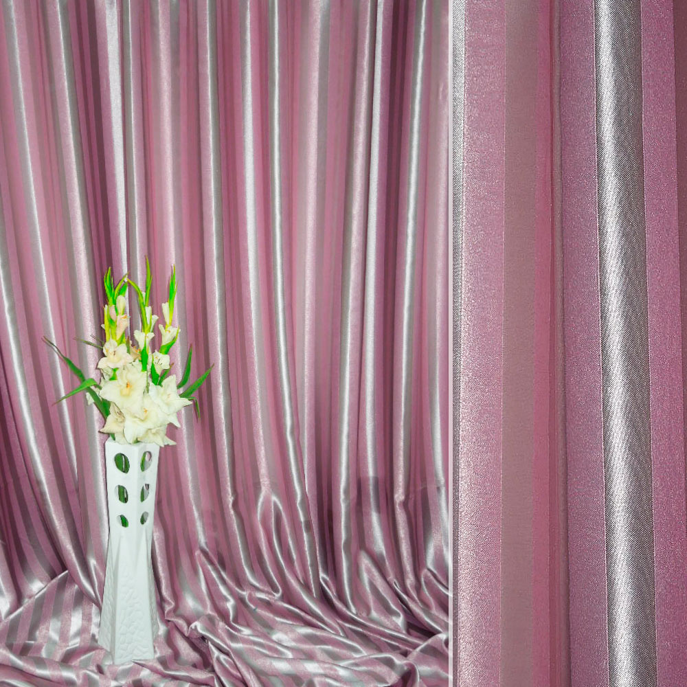 Опис Софт атлас блекаут смуги рожево-сріблястий, ш.275. Склад тканини: Поліестер-100. Щільність тканини 186 г/м.кв. Країна виробник: Південна Корея. Дякуємо за ваш вибір.
