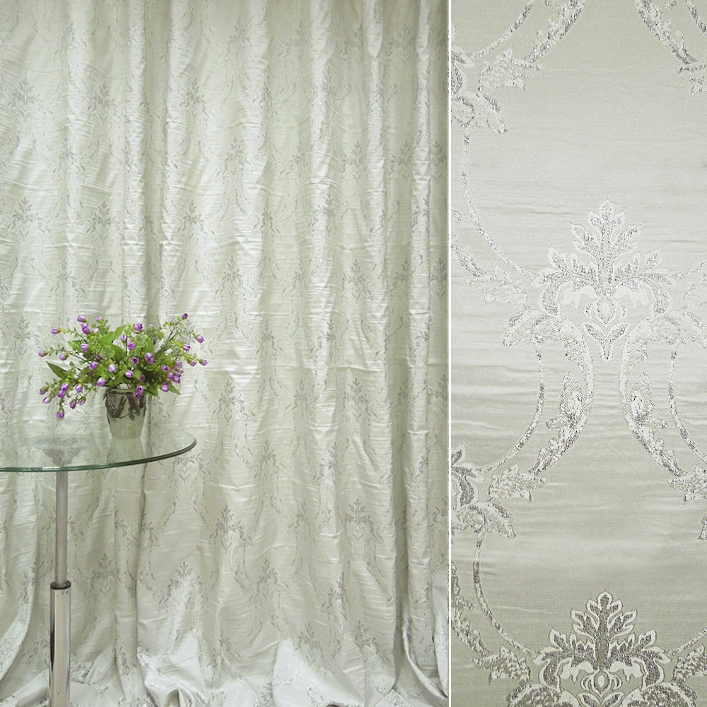 Опис Фукра з метаниткою для штор вензель сріблястий на молочно-сірому тлі, ш.280. Склад тканини: Метанитка-40, Поліестер-60. Щільність тканини 222 г/м.кв. Країна виробник: Південна Корея. Дякуємо за ваш вибір.