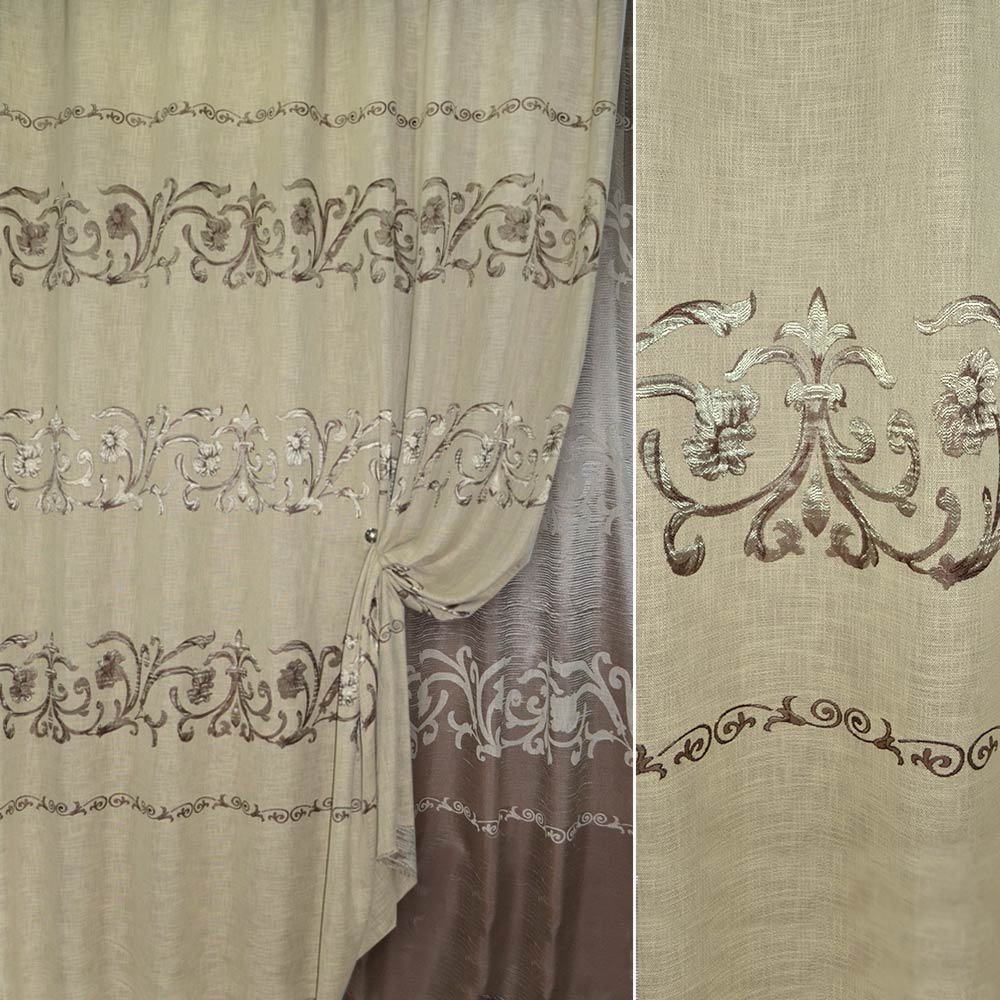 Рогожка з фукрою смуги вензель з квітами бежево-вишнева, ш.280 оптом