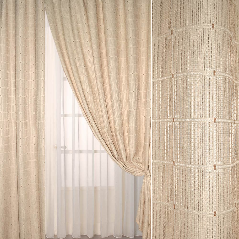 Опис Рогожка жаккард для штор клітина, коричневі нитки-смуги бежева, ш.275. Склад тканини: Поліестер-100. Щільність тканини 237 г/м.кв. Країна виробник: Південна Корея. Дякуємо за ваш вибір.