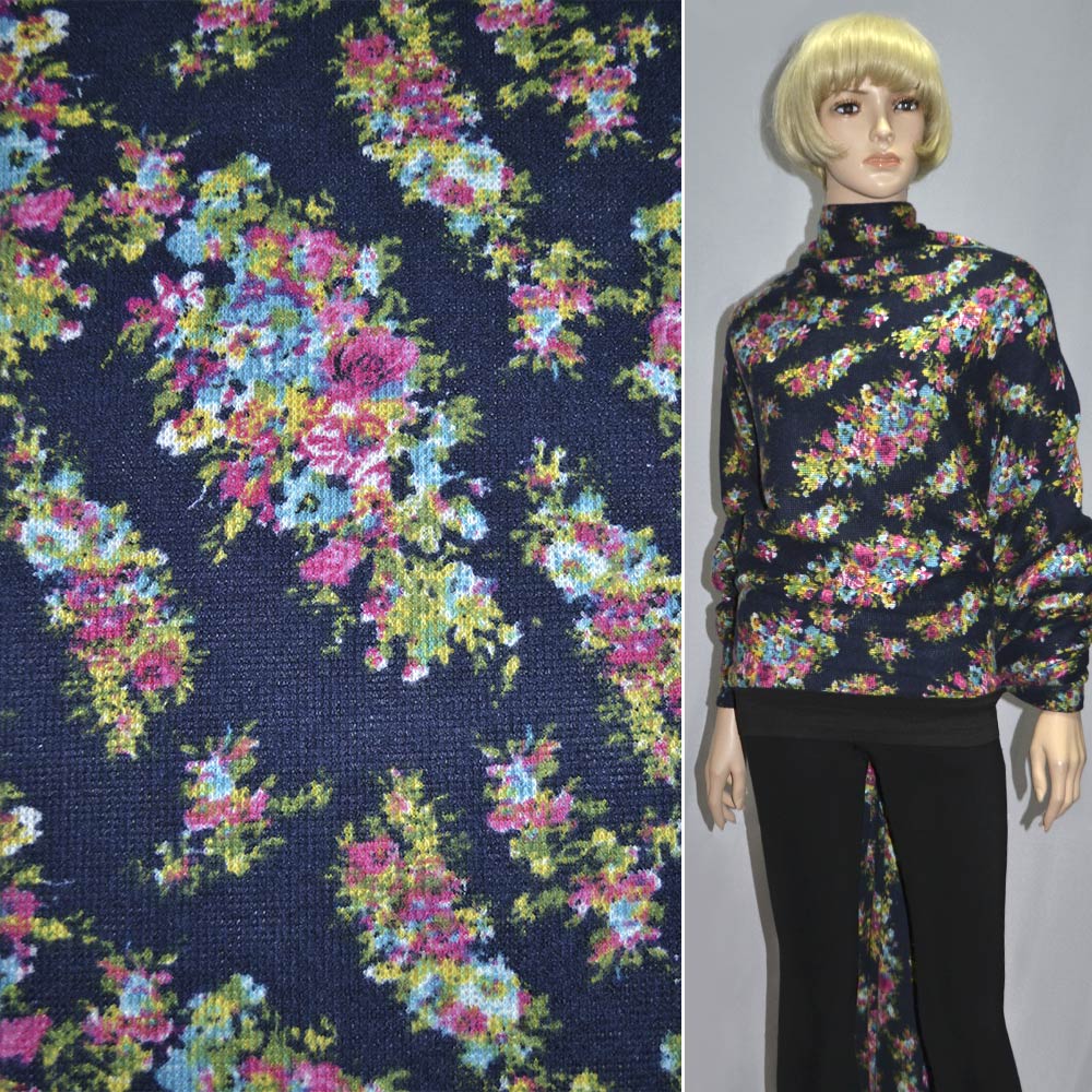 Опис Трикотаж з шерстю синій темний з кольоровими квітами ш.165. Склад тканини: Віскоза-30, Поліакріл-40, Вовна-30. Щільність тканини 293 г/м.кв. Країна виробник: Південна Корея. Трикотаж – це м'яка щільна матерія, не прозора. Приємна на дотик, комфортна в носінні. Завдяки вмісту синтетичних матерій, матеріал більш зносостійкий та надовго зберігає свій первісний вигляд. Наявність вовни робить матеріал теплішим. Тканина відрізняється своєю приємною текстурою, гарною розтяжністю, практично не здається. Трикотаж досить простий у догляді. Використовується для пошиття суконь, спортивних костюмів, легких жакетів, поло, футболок та багато іншого.Дякуємо за ваш вибір.