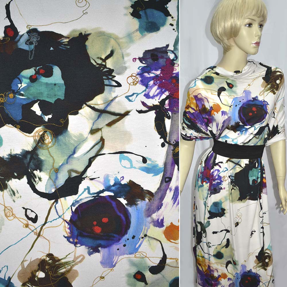 Трикотаж віскозний стрейч білий в абстрактний різнобарвний малюнок ш.145 оптом