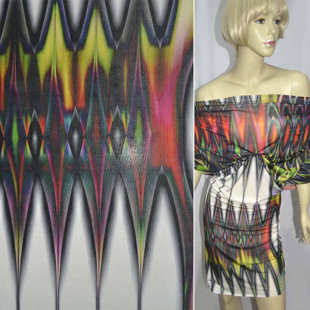 Трикотаж віскозний стрейч білий з чорно-червоно-жовтим малюнком (стріли) ш.150 оптом