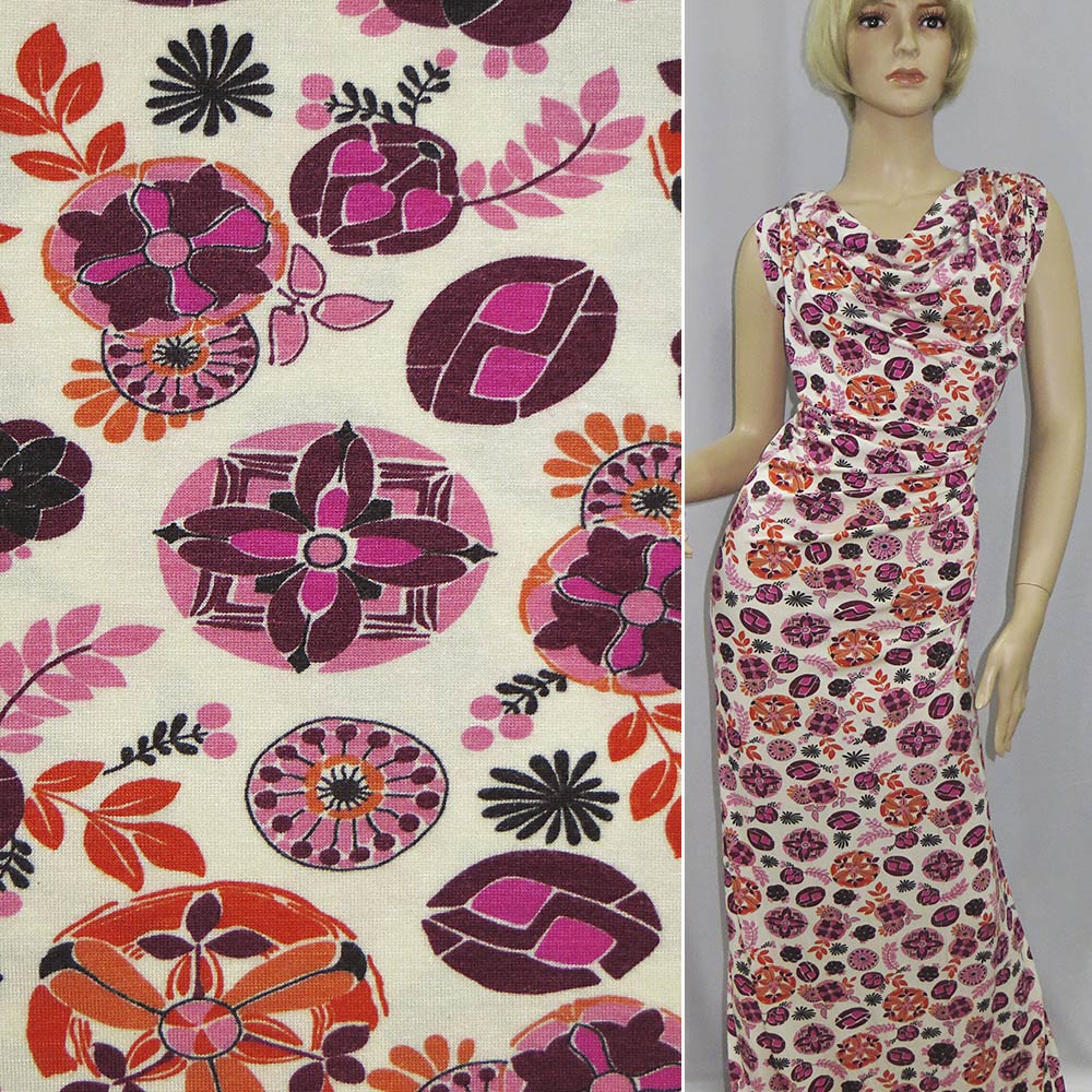 Опис Трикотаж віскозний стрейч білий в рожеві, помаранчеві, бордові квіти ш.154. Склад тканини: Віскоза-96, Еластан-4. Щільність тканини 220 г/м.кв. Країна виробник: Німеччина. Трикотаж – це м'яка щільна матерія, не прозора. Приємна на дотик, комфортна в носінні. Завдяки вмісту синтетичних матерій, матеріал більш зносостійкий та надовго зберігає свій первісний вигляд. Тканина відрізняється своєю приємною текстурою, гарною розтяжністю, практично не здається. Трикотаж досить простий у догляді. Використовується для пошиття суконь, спортивних костюмів, легких жакетів, поло, футболок та багато іншого.Дякуємо за ваш вибір.