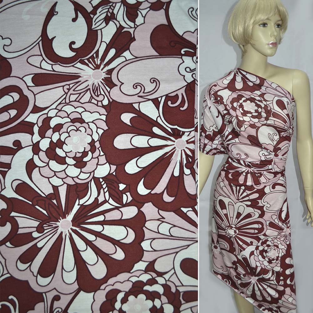 Опис Трикотаж віскозний стрейч блідо-рожевий з бордовими квітами, ш.160. Склад тканини: Віскоза-97, Еластан-3. Щільність тканини 212 г/м.кв. Країна виробник: Німеччина. Трикотаж – це м'яка щільна матерія, не прозора. Приємна на дотик, комфортна в носінні. Завдяки вмісту синтетичних матерій, матеріал більш зносостійкий та надовго зберігає свій первісний вигляд. Тканина відрізняється своєю приємною текстурою, гарною розтяжністю, практично не здається. Трикотаж досить простий у догляді. Використовується для пошиття суконь, спортивних костюмів, легких жакетів, поло, футболок та багато іншого.Дякуємо за ваш вибір.