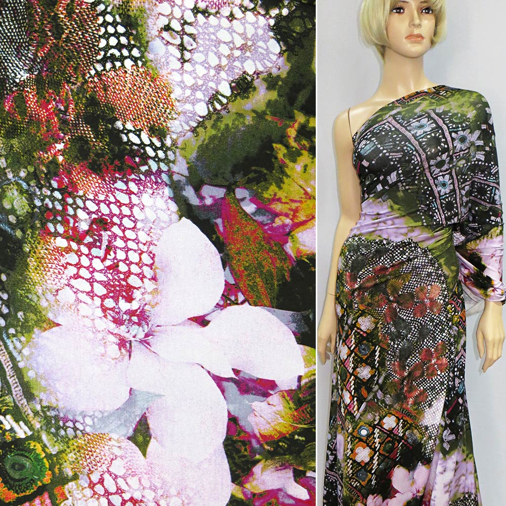 Опис Трикотаж віскозний стрейч чорно-зелений з бузковими квітами і камінчиками ш.153. Склад тканини: Віскоза-95, Еластан-5. Щільність тканини 208 г/м.кв. Країна виробник: Німеччина. Трикотаж – це м'яка щільна матерія, не прозора. Приємна на дотик, комфортна в носінні. Завдяки вмісту синтетичних матерій, матеріал більш зносостійкий та надовго зберігає свій первісний вигляд. Тканина відрізняється своєю приємною текстурою, гарною розтяжністю, практично не здається. Трикотаж досить простий у догляді. Використовується для пошиття суконь, спортивних костюмів, легких жакетів, поло, футболок та багато іншого.Дякуємо за ваш вибір.