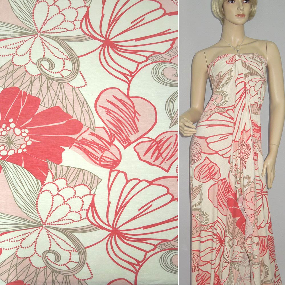 Трикотаж віскозний стрейч молочний з рожево-червоними квітами ш.150 оптом