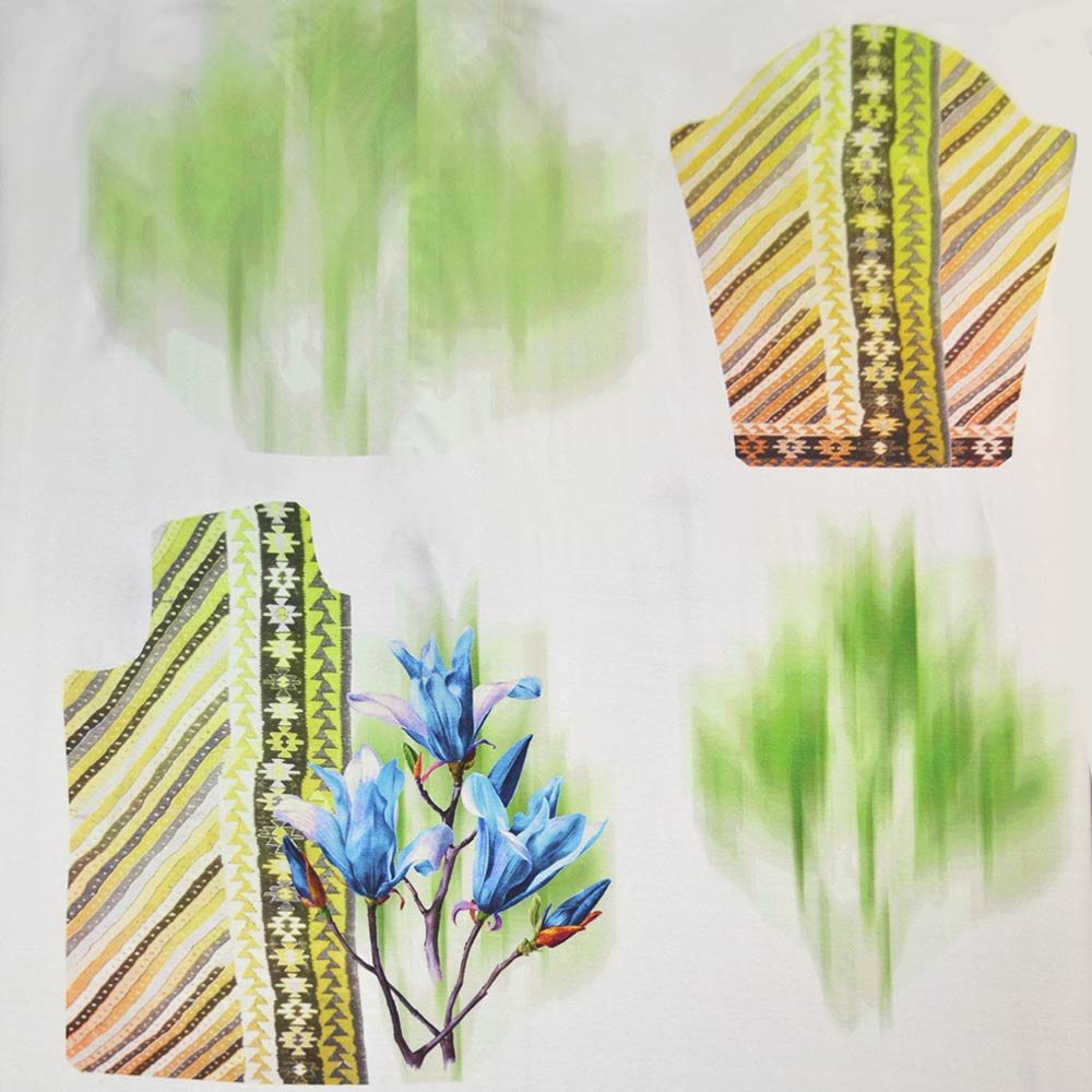 Опис Трикотаж віскозний стрейч молочний з салатовим малюнком і синіми квітами. Склад тканини: Віскоза-97, Еластан-3. Щільність тканини 197 г/м.кв. Країна виробник: Німеччина. Трикотаж – це м'яка щільна матерія, не прозора. Приємна на дотик, комфортна в носінні. Завдяки вмісту синтетичних матерій, матеріал більш зносостійкий та надовго зберігає свій первісний вигляд. Тканина відрізняється своєю приємною текстурою, гарною розтяжністю, практично не здається. Трикотаж досить простий у догляді. Використовується для пошиття суконь, спортивних костюмів, легких жакетів, поло, футболок та багато іншого.Дякуємо за ваш вибір.