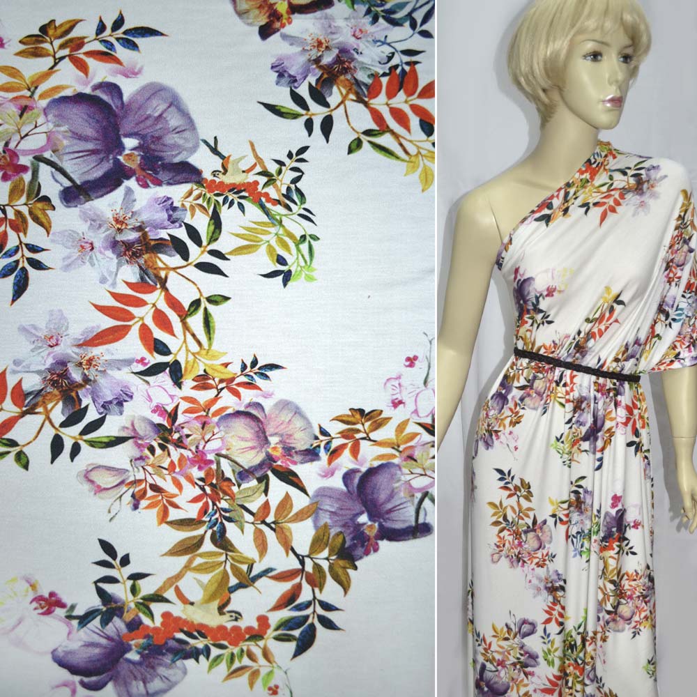 Трикотаж віскозний стрейч молочний з гілочками і фіолетовими орхідеями ш.150 оптом