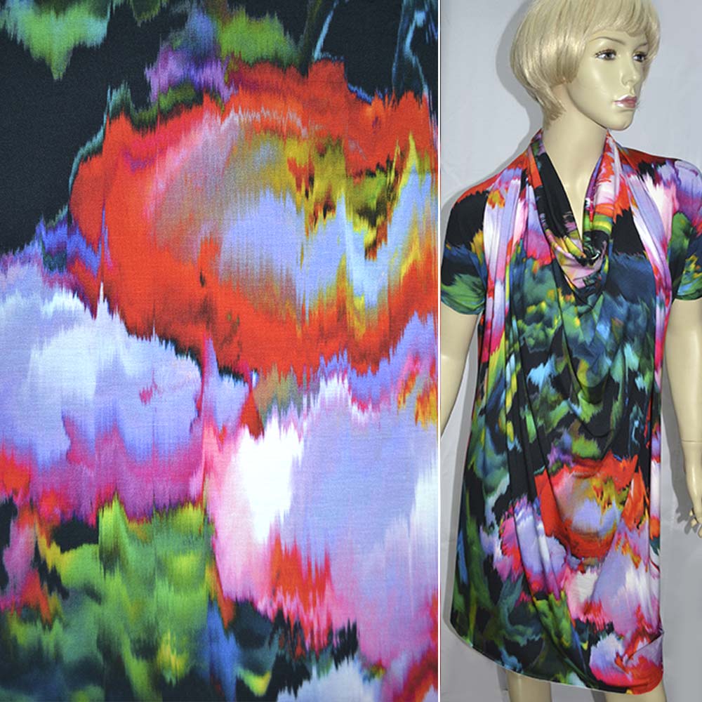 Трикотаж віскозний стрейч бузково-помаранчевий, зелено-чорний малюнок сяйво ш.140 оптом