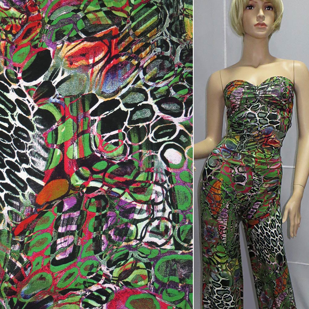 Трикотаж віскозний стрейч зелений в малиново-чорні кола ш.150 оптом
